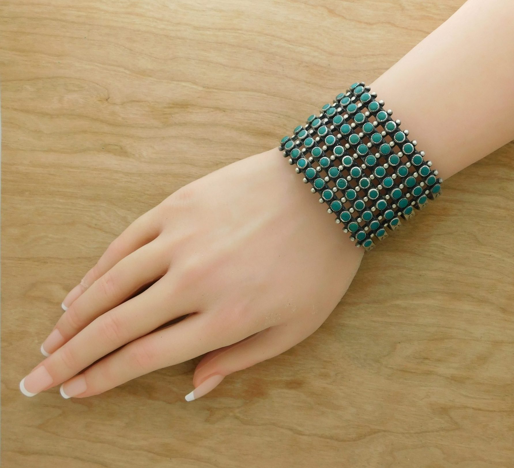 - Beautiful vintage sterling silver cuff bracelet with 78 gorgeous, green round faux turquoise stones in six rows.